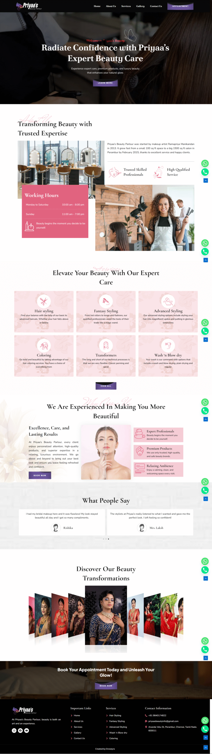 Priyaa’s Beauty Parlour offers professional beauty, grooming, and bridal services with a strong focus on quality, hygiene, and personalised care. With skilled beauticians and a wide range of skincare, haircare, and makeup services, the parlour ensures a comfortable and satisfying beauty experience for women of all ages.